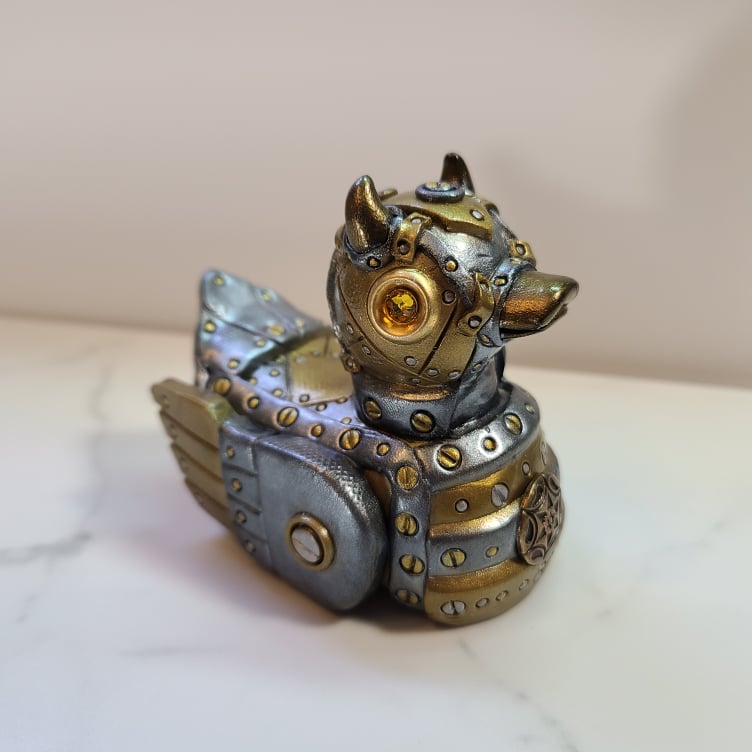Bring home this horned steampunk duck sculpture and add a touch of mechanical mischief to your collection today!