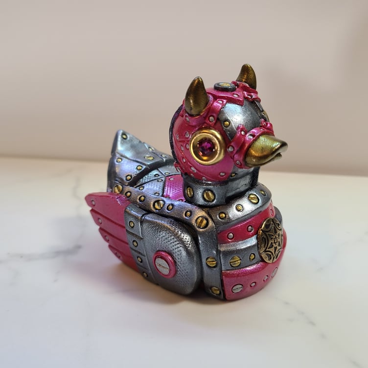 This handmade polymer clay steampunk duck sculpture blends quirky charm with industrial fantasy. Sculpted entirely by hand β never 3D printed or made from molds β each duck is detailed with gears, textures, metallic finishes, and a pair of whimsical horns that give it a mythical twist.