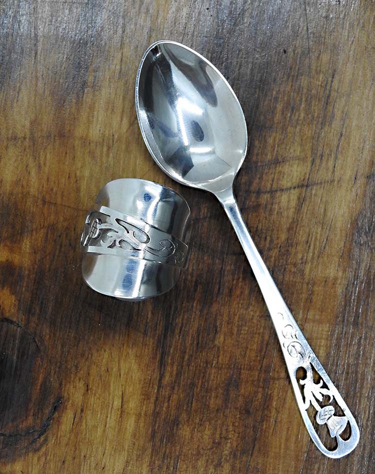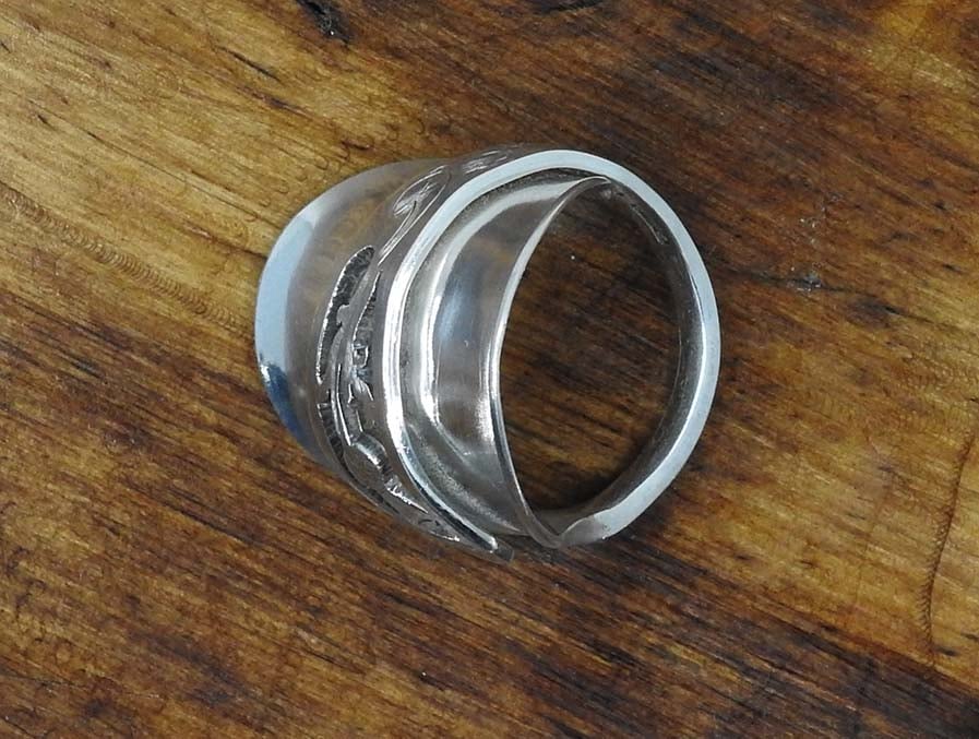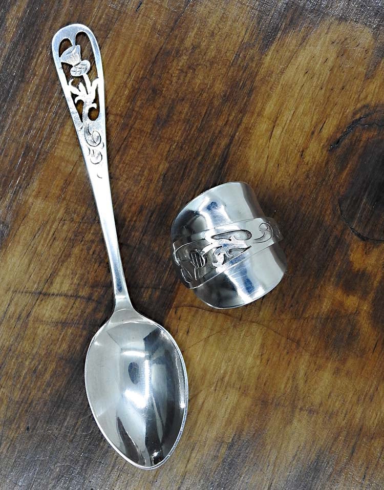 This handmade ring is crafted from a vintage Jas Ramsay (Dundee) silver-plated spoon, dating approximately from the early 1900s to 1930s. The original design features a striking Scottish thistle cut-out motif, once part of a collectible cased set. Repurposed into a ring, it carries both Scottish heritage and timeless craftsmanship — perfect for lovers of Celtic, Scottish, or antique jewelry.
