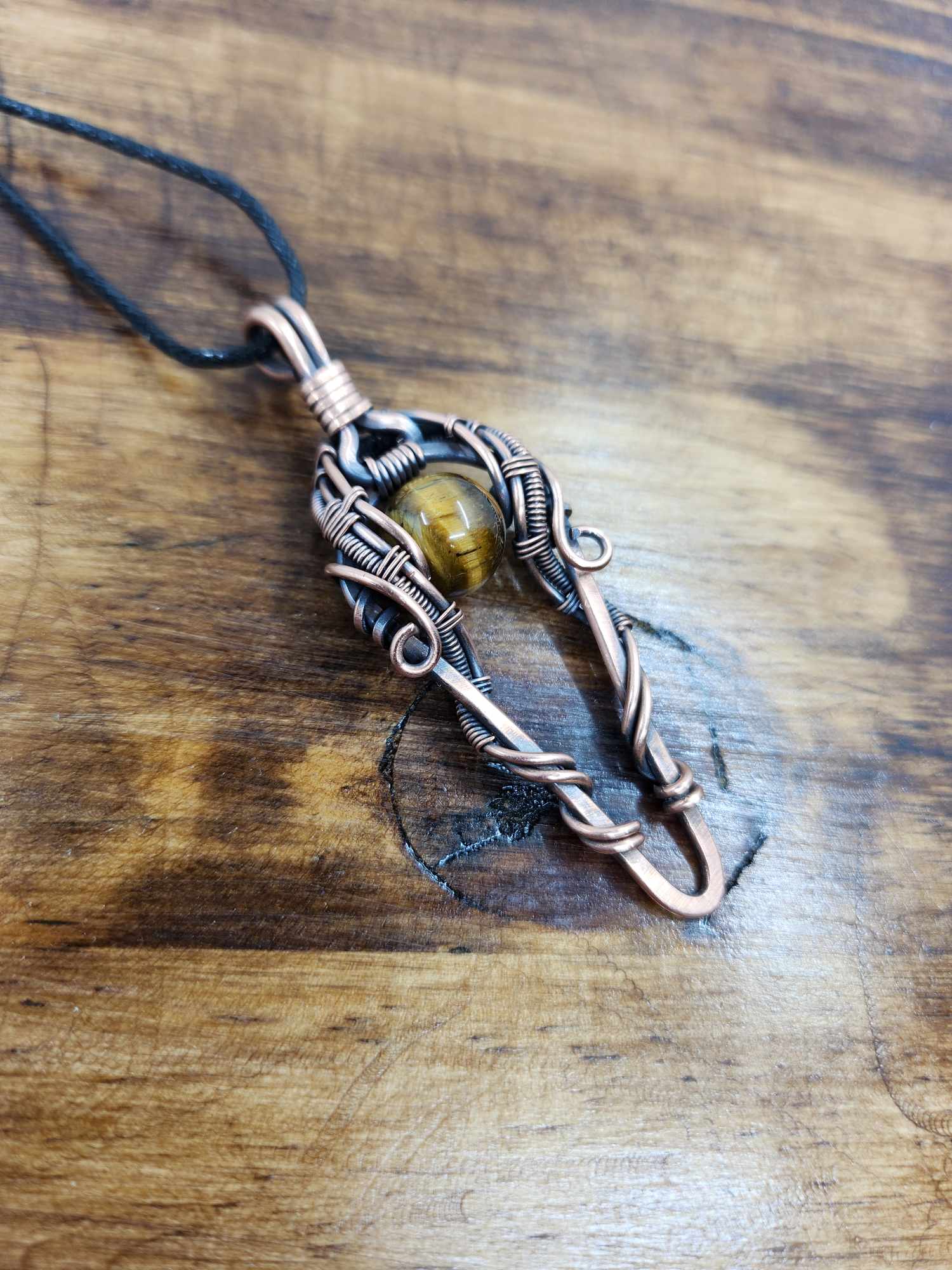 This 2.5-inch handmade pendant features a polished tiger’s eye gemstone set in intricate copper wire wrapping. The earthy tones and rustic design make it an eye-catching piece for men or women. Strung on a durable black cord, this unisex necklace adds strength, protection, and timeless style to any outfit. Perfect for those who love artisan jewelry, bohemian accents, or nature-inspired fashion.