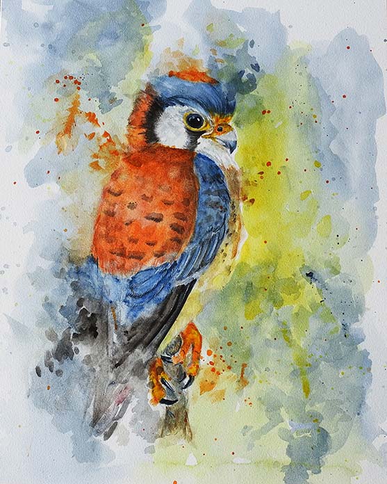 Vibrant 8x10 watercolor of an American Kestrel, painted on Aquabord—perfect for bird lovers, art collectors, and home décor. Prints are available too.